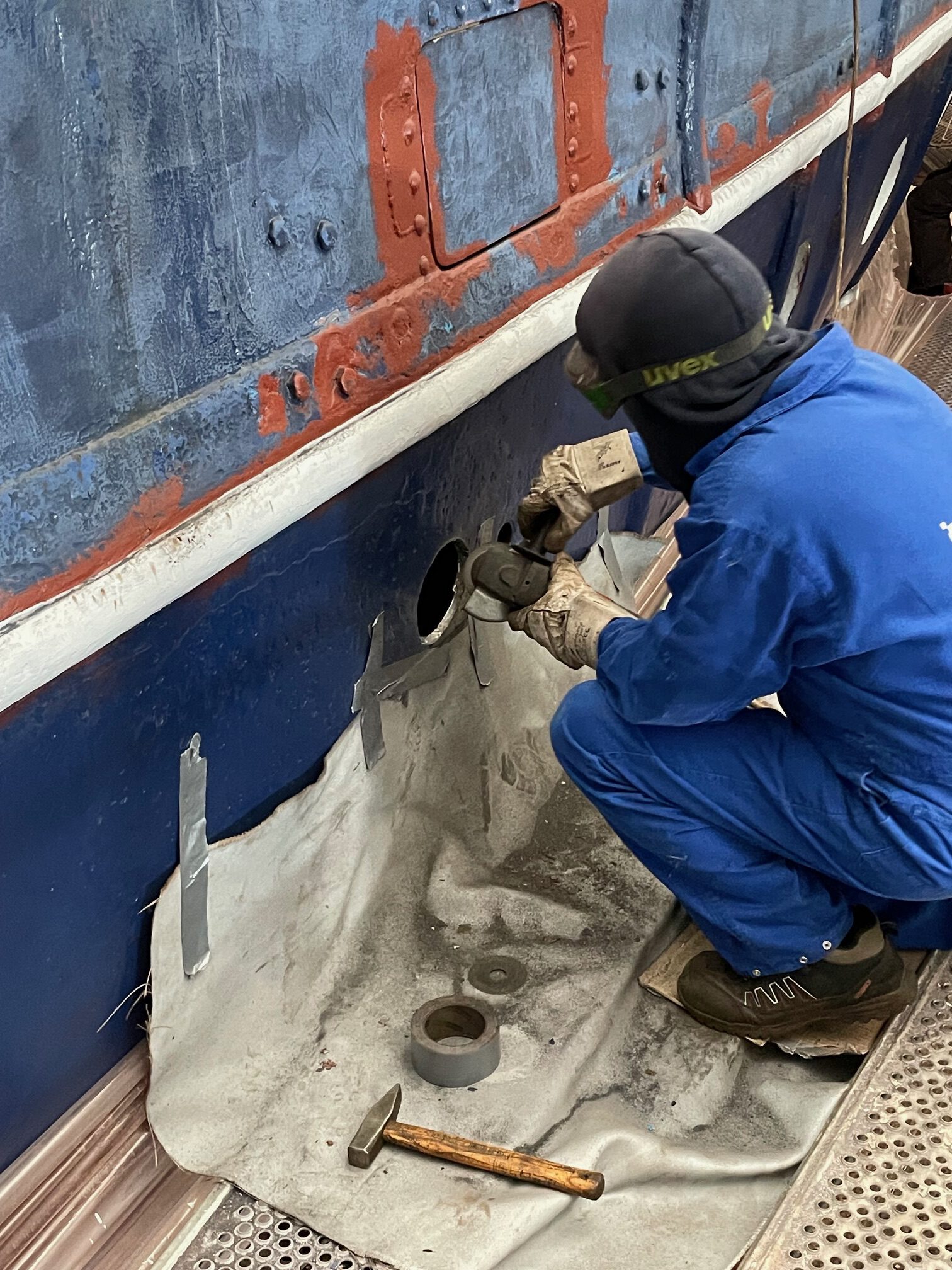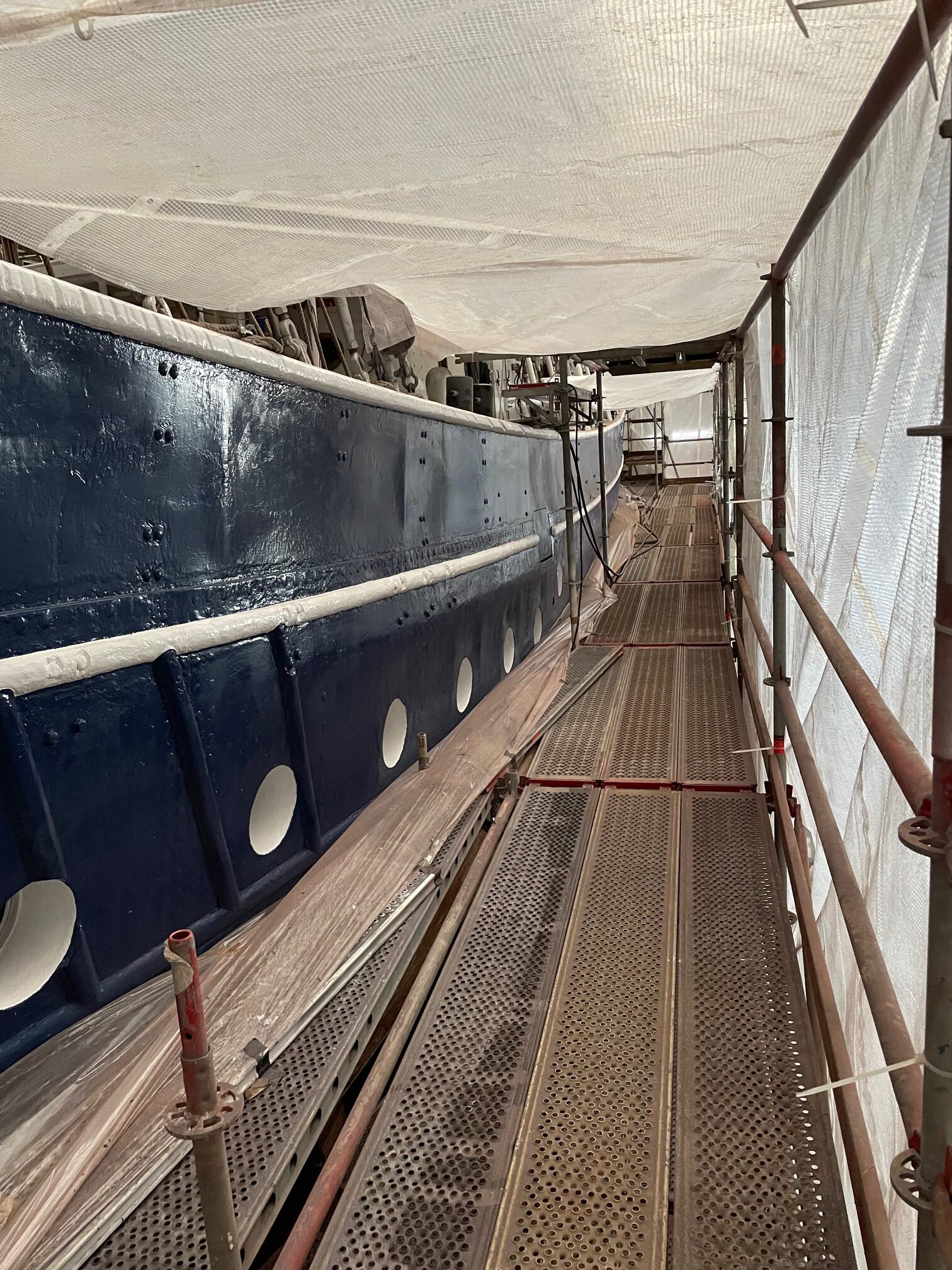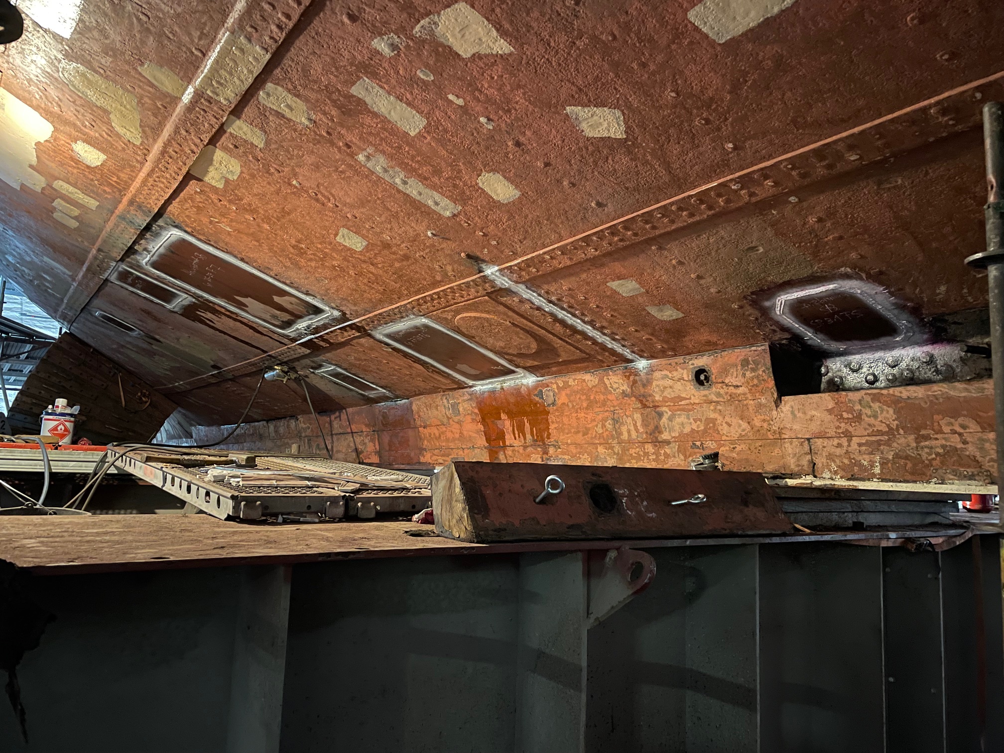 Alle Schadstellen am Rumpf sind durch neue Passstücke ausgebessert. Die Arbeitszugänge zur Beräumung des Kofferdammes sind wieder verschlossen. Alle Schweißnähte in sicherheitsrelevanten Bereichen sind geprüft und das Unterwasserschiff ist zur Konservierung freigegeben.