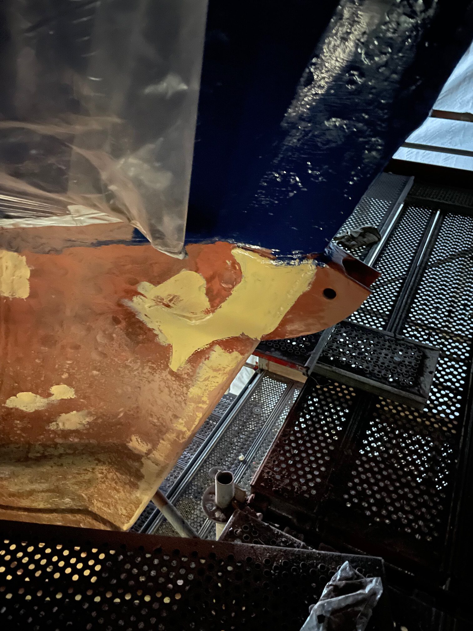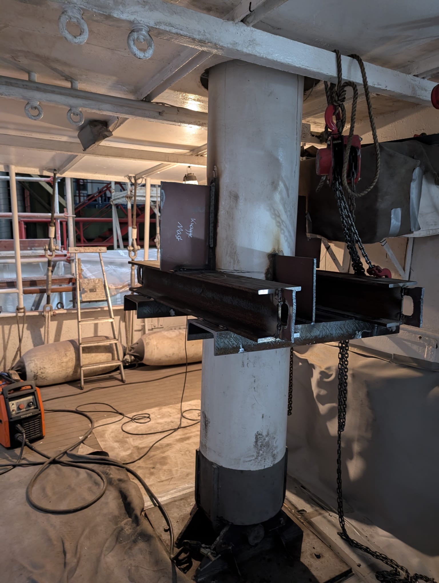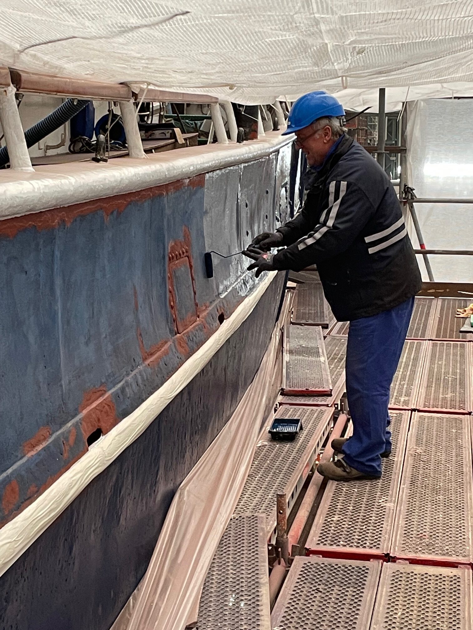 Die Mastfüße werden gewechselt. Dazu muss die Abstützvorrichtung angebracht und wieder demontiert werden. Alle Tanks sind abschließend zu konservieren. Nach der Trocknung des Unterwasseranstrichs wird umgepallt, so dass die bisher von der Pallung verdeckten Stellen gereinigt, geschliffen und auch konserviert werden können. Das Ruderblatt wird wieder eingebaut. Die Bremse der Ankerwinde wird komplett überholt und danach die Ankerkette wieder in den Kettenkasten eingeholt. Und unser IVECO Dieselgenerator, der in den letzten Wochen in der Motorenwerkstatt generalüberholt wurde, wird wieder eingebaut.
