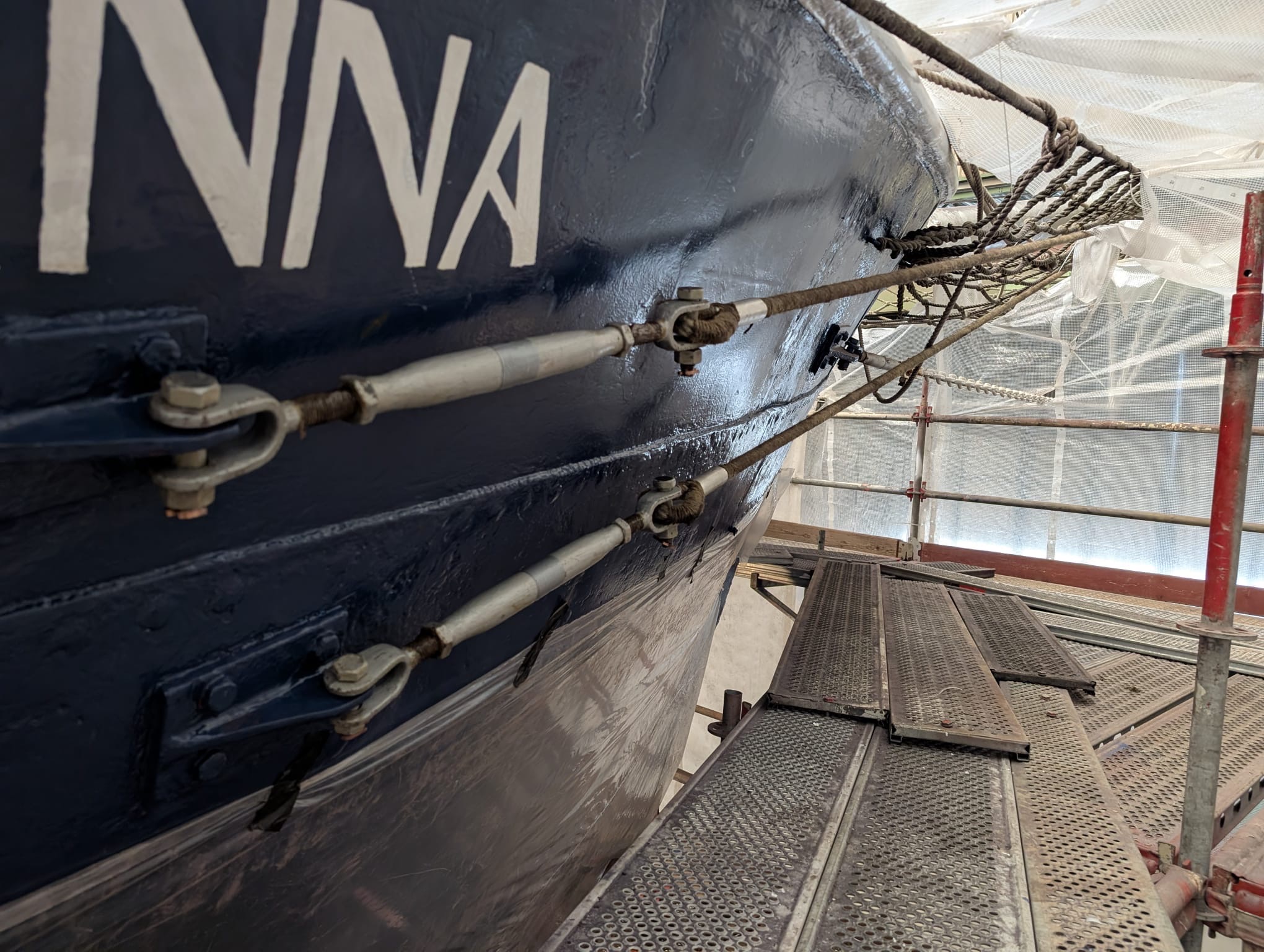 Die Klüvergeien wurden in unserer Rostocker Werkstatt erneuert, bekleedet, die Spannschlösser überholt und sind schon wieder am Schiff montiert.
